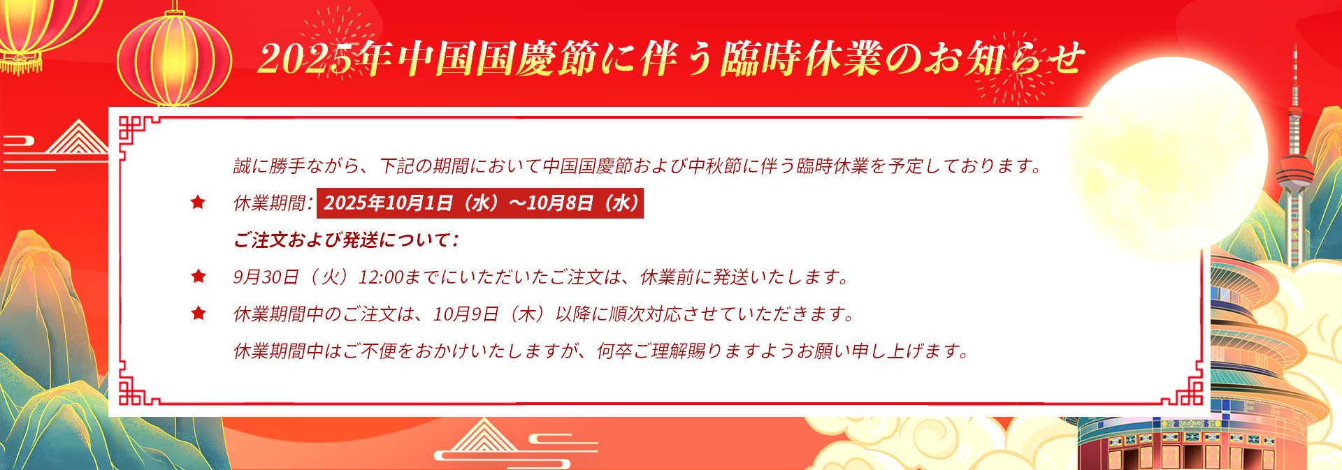 誠に勝手ながら、下記の期間において中国国慶節および中秋節に伴う臨時休業を予定しております。