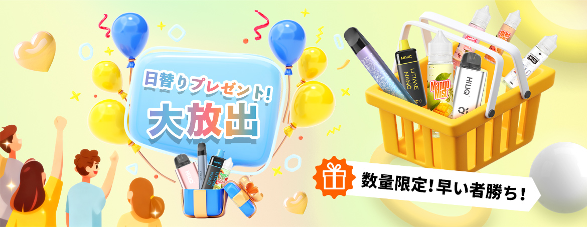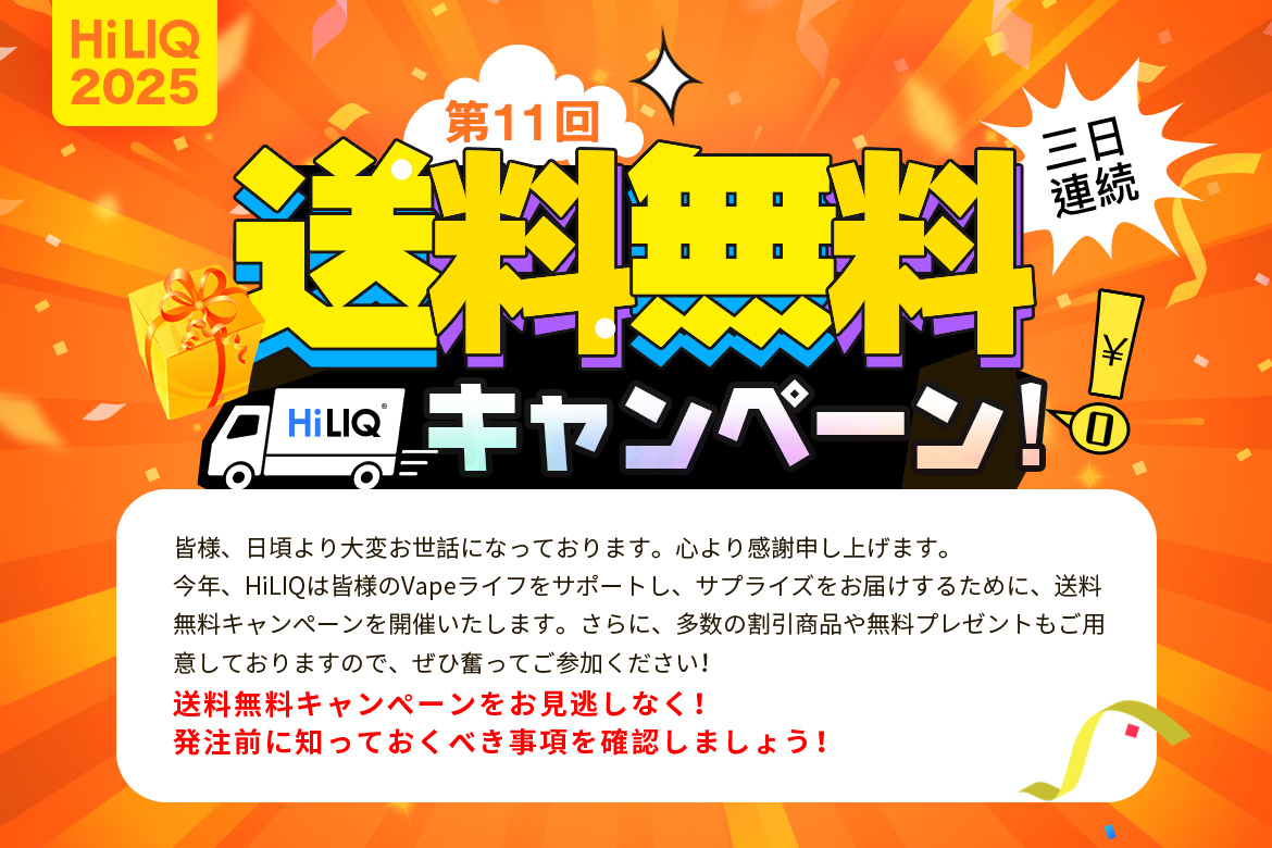 今年、HiLIQは皆様のVapeライフをサポートし、サプライズをお届けするために、送料無料キャンペーンを開催いたします。 さらに、多数の割引商品や無料プレゼントもご用意しておりますので、ぜひ奮ってご参加ください!