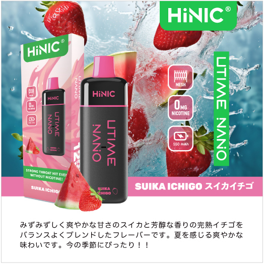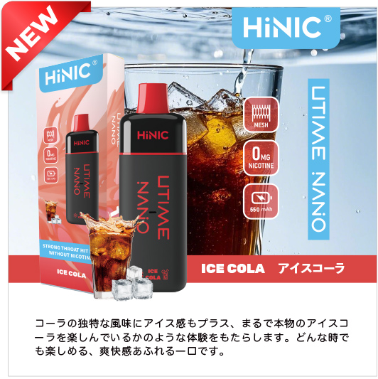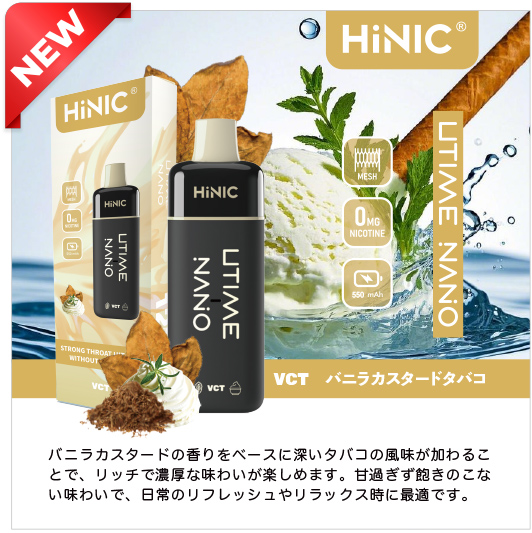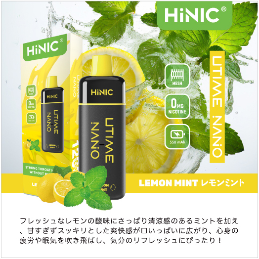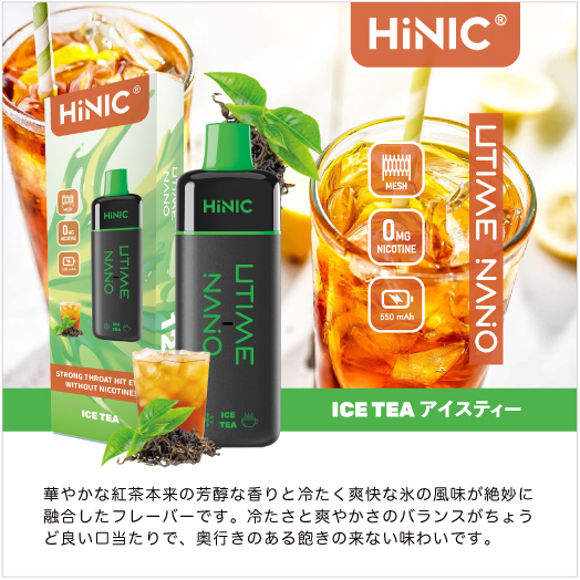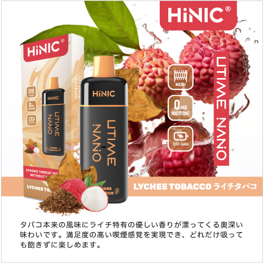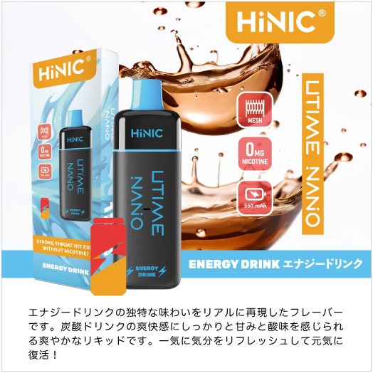 HiNIC Utime Nanoは独自技術でノンニコチンにも関わらず、タバコのようなキック感を体験できる吸い応え抜群の使い捨てVAPEです。また、メッシュコイルを採用して、リキッドを効率的に気化でき、リアルな風味を再現され、吸い心地さらにアップ!これ1本で「VAPE」をもっと簡単に美味しくお楽しみいただけます。