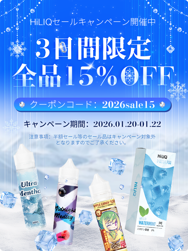 - 4、 電子タバコ専用リキッドです。必ず飲まないようご注意ください。